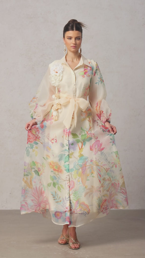Farrah Lapel Long Sleeves Flowers Printed Maxi Dress