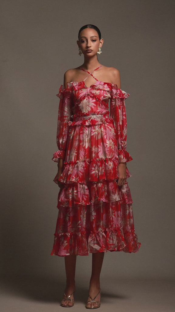 Yerza Puff-Midikleid mit Blumenmuster und schulterfreiem Schnitt