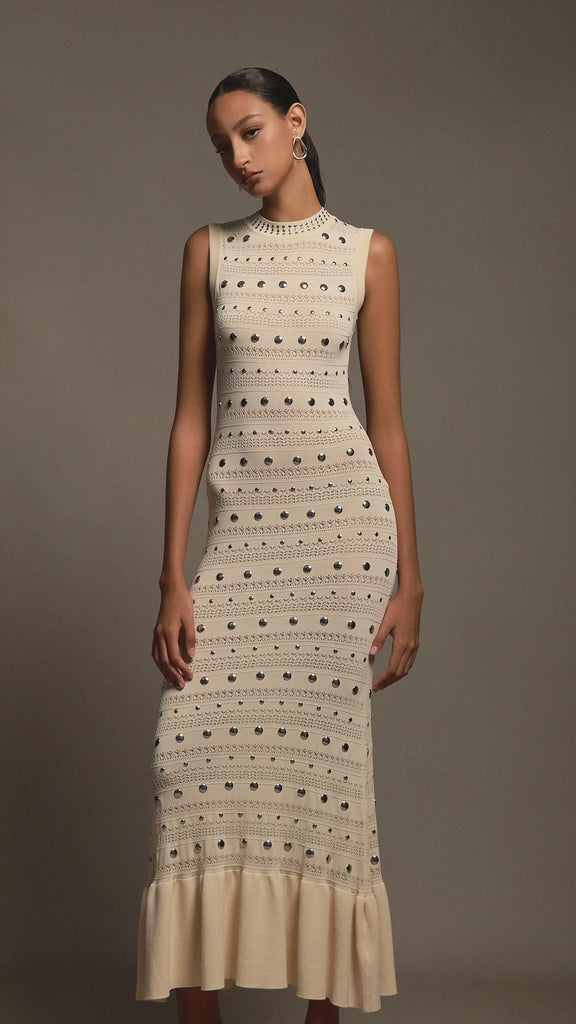 Verga Sleeveless Round Neck Rivet Folds Maxi Dress